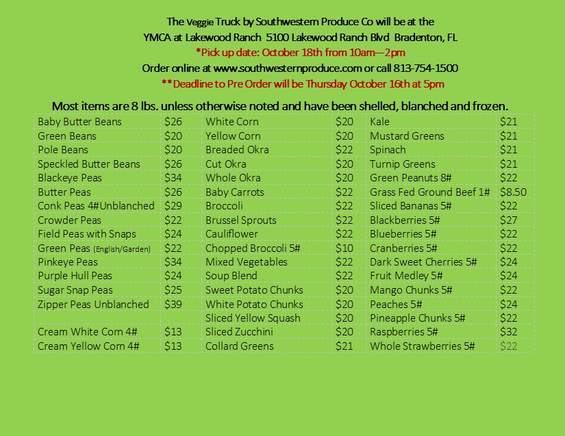 Online begins November 8th. Phone orders begin Monday November 10th thru Thursday November 20th at 5pm. The pickup will be in the parking lot of the Lakewood Ranch YMCA at 5100 Lakewood Ranch Blvd, Bradenton, FL on Saturday November 22nd from 2pm – 5pm. The card will be updated closer to the sale date