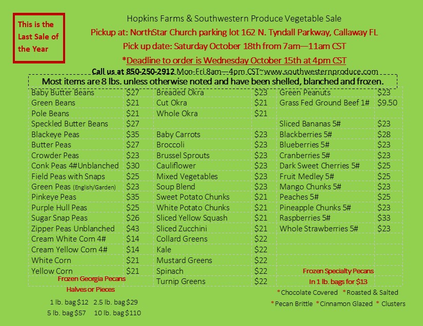 ***PLEASE NOTE NEW PICK UP LOCATION: PARKING LOT OF NORTHSTAR CHURCH – 162 N TYNDALL PARKWAY, CALLAWAY FL 32404************